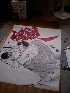 ペン入れ終了で次はどうしようか。 色を塗るなら道具を準備しなければならない。 何よりオレの塗り方だと出費が馬鹿ならない(ここ大問題) でも字は黒く塗り潰すよりは色を付けた方がいいだろうし・・・ ならばここはアレしかない。 同級メンバー2人を連れ作業開始。 「ここはここまでグリグリ塗って・・・」 「おぉ!ベタ指定か!!」 そうともいう(笑) それでどうなったかというと。 文字は赤マジック、袴&影を鉛筆でッ!!(うぉい!?) いや〜やっぱ消せるってすばらし〜!! しかしやり過ぎで消しゴムが黒く染まり・・・ 挙げ句の果てに黒の光沢を帯びた事はナイショです(えええ) (写真の中央右寄りに落ちている黒の正方形がそうです(笑) で、鉛筆でやると何が起こるのか。 角度によっちゃ光を反射し、一番黒く塗った部分が一番光っちゃうんです!! ○ケモンのカードで言うキラカードってことでいいらしい(笑) それよりビニールかぶせるとはいえ、これすると雨が怖いんですけど。 大丈夫なのか・・・?(汗) そしてついでに。 オレの指も光っちゃうんです!!(光らんでよし) さて明日で仕上げっぞ〜い。 ちなみにこの看板。 オレの行ってるキャンパスではなく、部室のある方のキャンパスに置かれます。 日が経つに連れて看板の状況が把握できないのはちょっと心配(汗) PR TrackbacksTRACKBACK URL : CommentsComment Form |