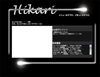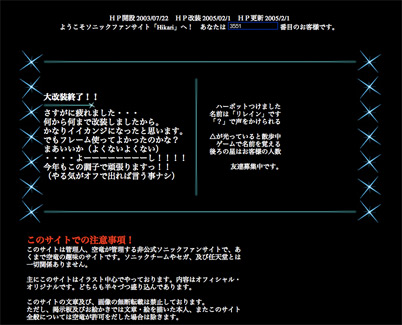 暴れたかっただけ(爆) 今日は過去ものを発掘してた。 あまりの成績の悪さにオヤジにハードディスクぶっ壊されたパソコンの中のデータ。 結局本人が何を思うたか、ハッキングじみた手法でデータ全部引っ張り出して元通り。 その時携帯も折ったといいながら折ってなくって1週間後には出してきやがった。 正直逆に腹が立った。 もっとどん底にたたき落とせばいいのに、なんでそう甘い汁を吸わせるのか。 そんなこんなで、今使ってる携帯はまさにそれ。 電池パックのネジの部分は、オヤジに無理矢理開けられそうになった跡が残ってる。 ・・・ごめんな。 で。発掘してきたものの中には落書き以外にもいろんなものがあったりして。 公開してた小説。公開してなかった小説。途中までしか書かなかった夢小説。 挙げ句、このサイトがHikariだった当時のHTMLタグ。 そのサイトのために作った素材も。 ・・・そろってるなら復活させちまえ。 と、いうことで。 画像のタグだけアドレスを取っ替えて、はい元通り。 2005年2月1日付けで、このデザインになってたようです。 てか元サイト消してないから未だにカウンター生きてる・・・(笑) 残念ながら全部は復活出来なかった。 というのもイラストページと小説ベージは、大した小細工もなかったし、 この後同じリンク先で改装したから、タグを残してなかった。 まぁ、新しいブツのテッチョが点滅するかしないか程度だったしね。 サイトのデザイン案を書いた紙が未だに残ってるから、 それを参考にすれば元には戻る。復活させてもいいかもしれない。 今のサイトよりは楽しいと思う。小説も堂々載ってたしね。 今読んでたらかなり吹くけど。 第一ソニックの設定はヒーローズかソニバト止まりだし? それにしても・・・ジャビさん・・・(笑) 当時はとにかく小細工するのに必死。 テーブルタグの乱用、1枚の画像に対する複数のリンク、 メニューバーの先っぽ、ピカッってる部分に円形の隠しページへのリンク。 当然当時は「スタイルシート?なにそれおいしいの?」だったわけで。 いや、多少は組み込みのスタイルシート使ってたけど、 背景表示とスクロールバーの設定ぐらいで。 アンチホームページビルダー派、ノットスタイルシート。 今もそうだけど、さすがにスタイルシートは使えるようにならないとマズい。 テーブルタグなんて手間が全然違う(汗) 今のサイトはあまりにもつまらない。 というのも、一番小細工したかったイラストページの更新が出来ない状況にあるから。 今のサイトは迷路にしようと思ってた。 イラストページではリンクを見つけては深みにハマり、 いつになるのか終わりが来るのか分からないほどにページが存在して。 トップページに戻って来た頃には、そこにあるリンク先すべてが差し替えられてて。 小説も、オリキャラの設定も、くだらない会話が出来たり、いろいろ考えてた。 それも出来ずじまい。 未だに考えてることはある。 対話。一方的に見せるんじゃなく、対話。 元々サイト自体に組み込んだ部分と、そうじゃなくオレが対話に参戦するような感じ。 そこにあるコンテンツだけでも楽しんでもらえればいいけれど、 それ以上に相手の投げかけに対してもっとリアルな返答をしたい。 その日あった対話を見て、オレが更新をかけて、次にその人が来た時には返答する。 対話内容によってはサイトで見れる内容が変わったり、裏話が聞けたり。 そういうの。 もしそれが実現出来たとしても、きっと自己満なんだろうな。 やりたいと思うけど、自己満でしかないならやる必要がないし。 |