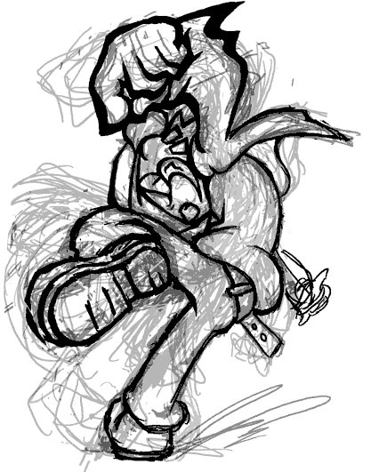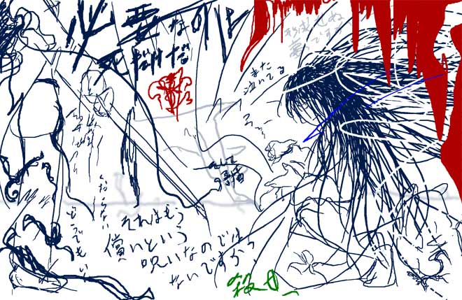 調子をこいてて生意気なコイツをたたき落とすような。 久々にカーテン締めて電気も付けず、ただベッドにボーッと座ってた。 頭の中をいつも通りグルグル映像が回る。 煮えくり返ったものを吐き出すように叫ぶ。 口からヨダレが出ようが血が出ようが内蔵が出ようが関係ない。 叫べば叫ぶほど寒気がして、そのまま散々暴れ回る。 何もなくなった空間で暴れ回る。 挙げ句自分の腹を貫く。痛みも何もなくて余計に腹が立つ。 そうやってると、風の吹く音がよく聞こえる。 窓がカタカタと音を立てて。 閉め切っているはずなのに、どこかスッと冷たい空気が服を通り抜けて摩ってく。 そうやってまた体が冷える。久々の感覚。 また家出ごっこでもしたいな。 でもいつものように理由がつけられない。 誰に怒られたわけでもない。怒っているのは自分だし。 そのまましばらく寝てた。1時間か2時間か。 そんな中で見た夢は意味の分からないものだった。 舗装された道が螺旋を描きながら続く山の中。 何故か帝王と山のてっぺんに向かって走ってた。 しかも帝王、まだ髪染めてなかったし整形もしてなかった。 小学生の頃の姿のままだった。 そんなことはさておき、大きな音でアナウンス。 「もうすぐレースを開催いたします」 「早く戻らないと」 「くそっ」 かなり先の方まで行っていた帝王は面倒になったらしく、 崖の上から飛び降りて来て、オレの横に降り立ったかと思ったら、 元着た道を全力疾走で降りていった。 必死で自分もそれの後を追う。 意味不明なレースだった。 デカめのストロー、直径4センチぐらいの太さで長さが50センチほどのストロー。 そのストロー3本で1本、計6本で出来上がっている竹馬で2人乗り。 当然ストローは重さに絶えきれず、先っぽが折れ曲がる。 それでも竹馬で全力疾走。そういうレース。 さっきの山道を少し外れ、海の方へ続く道を行く。ゴールはその砂浜。 最後の砂浜へ続く階段。 とにかくこの竹馬にさえ乗っていれば、折れていようがどうでもいい。 帝王と2人して階段の途中から砂浜にダイブしてゴール。 無茶苦茶をしたもんだから大会新記録。笑って終わった。 目が覚めて思う。意味が、わからん。 それでもスカッとした。そういえば最近走ってない。 中学校運動会200m走3年間オール1位だったオレ。 まさに脳みそ筋肉。帝王には走っている姿をサイボーグと呼ばれ、 ビデオにはっきりそのセリフが残ってる。 「あ、サイボーグの電池が切れた・・・あ、戻った」 走り終えてそのビデオを見た時、吹き出した。 勉強は嫌いだ。働くなんてもってのほか。一生遊んで暮らせばいい。 それで自分が死んだって、悪いのは自分であって誰でもない。 「勉強しろ」だなんて押し付けるな。 そんなものはやりたいヤツに言えばいい。そう。 本当に知りたいと思ったことだけ、自分から勉強すればいい。 走りたくなったら。走ればいい、だろ。 鬼ごっこは好きだ。氷鬼とドロケンはよくやってた。 どこで鬼を巻くか、どこに隠れるのがいいのか。 学校中を巻き添えにして、先生に怒られる。 「そこは下履きに履き替えろ!!」 はい。すみません。 あぁ。あの頃はよかった。 女も男も関係なく、ただひたすら15〜20人ほど人を集めて暴走。 最近は、ホント。つまらない。ギャグも少ない。喧嘩もない。 青あざまみれで帰るようなこともない。 年上の男子に水筒で殴られて大きな痣を作って、散々恨み倒したものの、 当の本人が引っ越ししていったり、誤ってカッターで親指ぱっくりして、 神経いっちゃってて痛みなんかないから、 笑いながら廊下を走っていくようなこともない。 つまらない。ホントつまらない。 何かこう、大きなことをしたい。 「遊ぼうか!」と言って人を集めて。 満足するまで遊び倒して。でもまた人に迷惑をかける。 「人の田んぼで遊ぶな!!二度と来るな!!」 3年4年と遊び続けた田んぼや畑を追い出され。 挙げ句田んぼは家が立ち並んで。 ・・・あぁ。人間なんか嫌いだ。 そこにいた虫も草も、自分たちで育てていた作物も。 全部全部自分の都合みたいに。 ・・・また変な方向に頭が流れてる。こうやってまた人間を恨み出す。 間違っているのはオレだ。自分を否定してないと到底やってられない。 そのうち本当に人を殺しそうになる。 「殺すなら私を一番に殺して♪」 あぁそうだね。約束だしな。お前も、オレを頼る馬鹿共も。 みんなみんな後悔するさ。 なんという馬鹿を頼っていたのか。なんでこんなものを生かしていたのか。 そうやって恨み苦しみ。後悔する。 言ってるだろ。オレは誰にもなれないし、誰かがオレになることもない。 オレにお前は分からない。お前にオレは分からない。 分かったような口ぶりで。何も知らないままにオレを認めて。 後悔しろ。後悔すればいい。 あぁ、こいつに生きる価値なんでどこにもなかったってな。 2009.03.24 Tue 22:52:24 振り返れば夢がある昨日30分程度で描いたgifアニメ。
