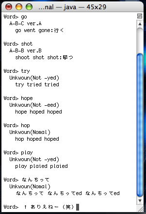 完成しました。というか途中で妥協しました(おい) どんな感じに妥協したってーと・・・ goとかshotは不規則動詞でちゃんと抑えられてる。 tryも不規則動詞でないとは言え、変換させてtryedと出ずにtriedと出る。 hopeも、変換させてhopeedと出ずにhopedと出る。 ちなみにwentと入れてもgoと同じ結果が出る。 edで終わるヤツはedを取ったものが原型ってことで無理矢理結果出る(え) ってなわけで元から過去形や過去分詞形で入力しても対応できちゃう。 しかし。 hopはhoppedなんだよ。hopedじゃhopeと被ってるし(汗) playは代表的だろ。yはyのままplayedだろっての。 yだからってiにする動詞の方が多いけど、例外抑えろよって話。 ひどいのは「なんちってed」だな。 おま、日本語だろ・・・! Unknownなのは確かだけど、全然Nomalじゃねぇだろ!!(汗汗汗) そんなこんなで。 不規則変化する動詞は抑えられてるのに、普通に変化する動詞はリスト作ってないから (そんなことすると本気で全部の動詞調べて作らにゃいかんくなる・・・) えらいことになるプログラム完成・・・ってダメじゃん(笑) 文字重ねるヤツは母音がどうとかあるらしくプログラム的に条件難しいから こっからさらに例外調べて対応させるかぁ・・・? さすがに面倒くせぇなぁ...orz 2008.05.30 Fri 23:43:50 文理デッサンの課題提出してきました。