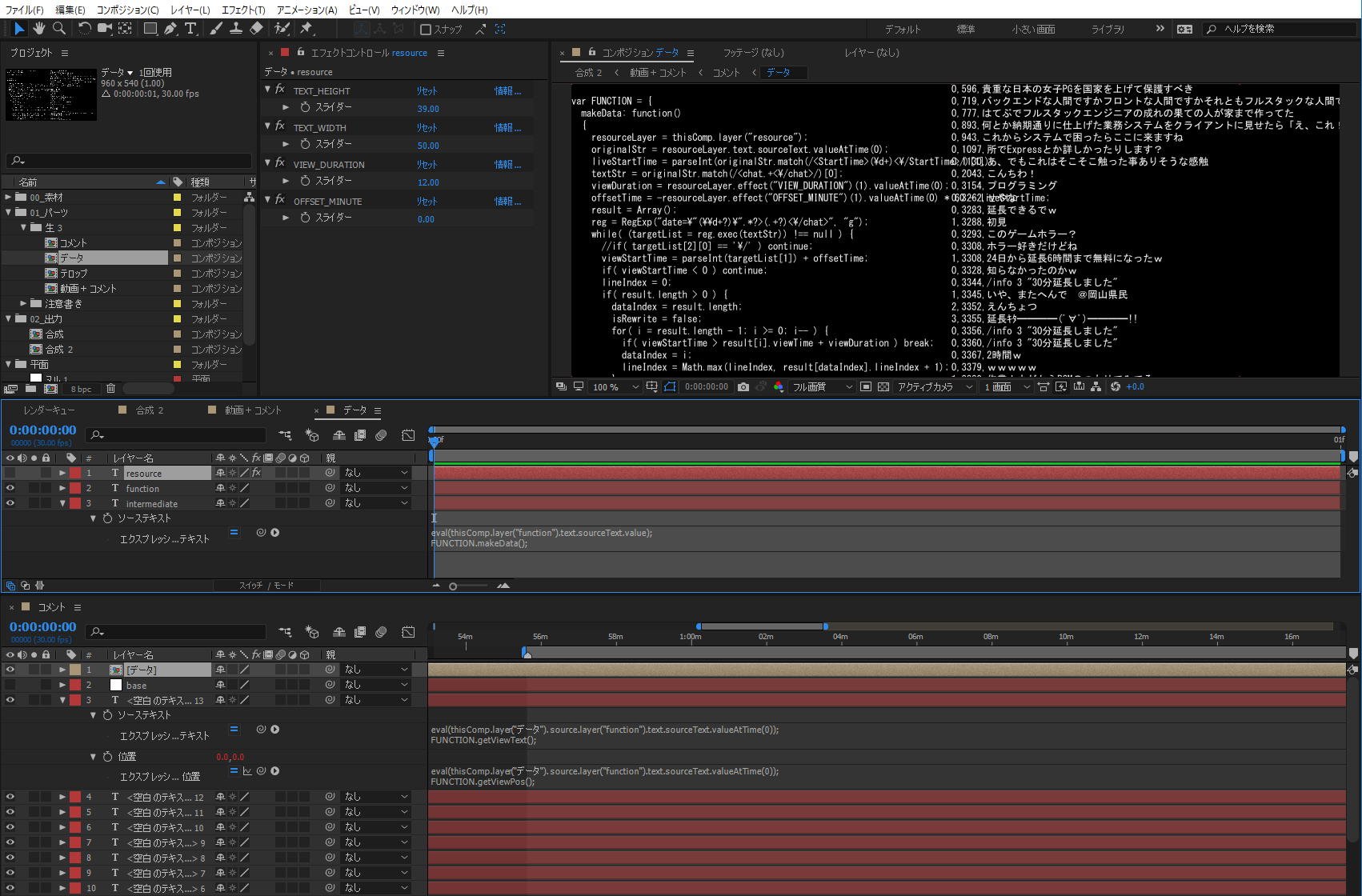 生放送動画(配信映像+コメントの動画)を投稿するにあたり、自分がやったことを、 ログ残しがてら、ぶっちゃかす。各々の細かいツールの仕様や操作等々は省くのであしからず。 【なんでこんなややこしいことを…?】 「生放送動画なんてタイムシフトの画面をキャプチャするんが手っ取り早いやん?」 「投コメでコメント再現した方が文字列データとしても残るで?」 「探したら確かそういう動画を出力するツールあったと思うんやけど…」 ごもっとも。理由を挙げるとしたら… 「コメントの流し方(アニメーション)を制御したかった」になる。 「興味半分で作ってみたかった」とも言う。 具体的には、表示時間や配置位置をコントロールできるようにしたかった。 ニコニコのコメントは3秒で、画面右から左に、画面上から順に流れる仕様、とのこと。 これを少なからず、もっとゆっくり、動画へのコメントと被らないよう、 画面の下から順に流れるようにしたかった。 あとは、今回はシステムコメント排除ぐらいしかしてないけども… 既存の配置や配色設定、あるいはこっちで定義した特定文字列やユーザーを検出して、 表示方法を切り替えるってのも、できる状態にしておきたかった。 「自分のコメントは動画化するときには含めて欲しくない」とか要望があっても、一応対応できる。 他、お遊び定義を入れて遊んでもいいかな?とも思う。 ついでに自分でテロップ用の文字列情報作って流し込めば、別に生放送動画じゃなくても、テロップ機能として使える。 アニメーション方法の定義を自作でするわけだから、好きなようにできるし、まあ後々自作動画で何かしたいときに使えるでしょう。 ま。そんなかんじ。 【動画投下までの手順&解説】 1.NiconicoLiveEncoderで放送映像をローカル保存 2.NiconamaCommentViewerでコメントをファイル保存 3.AfterEffectsで動画とコメントを読み込んでエクスプレッションで コメントを合成&必要あれば編集 4.MediaEncoderでレンダリング 5.ニコ動に投下 1.NiconicoLiveEncoderで放送映像をローカル保存 「配信時に録画を行う」設定を入れておけば、勝手に保存される。 ここで保存される映像は、実際に配信したタイムシフトのような映像…ではなく、 ツール側が配信するために取り込んだ大元の映像なので、例え放送準備中の段階であっても、 ツールの「配信開始」ボタンを押した瞬間から、ぜーんぶ保存される。 ツール側の不良がない限りは、ニコ生側の配信関連サーバーエラーによる画面真っ暗期間も関係ない。 細かいところを気にしだすといろいろ融通は利かないのかもしれないが、便利。 2.NiconamaCommentViewerでコメントをファイル保存 接続して表示した生放送コメントを「名前を付けて保存」すれば、xml形式で保存化される。 使うコメントのデータはこれ。 一応「テキスト形式で保存」もしておく。 こっちの方が情報量は少なくて見やすいので、こっちでコメントされた再生時間を確認する。 最初はテキスト形式の方を元データとして読み込んで解析&使ってたけども、1コメントの情報の区切り文字がタブだったり改行だったりで、 コメントそのものにソレを使われたら1コメント分の解析ができなくなってアウトだなと思ったから、やめた。 細かい解析処理は3で。 3.AfterEffectsで動画とコメントを読み込んでエクスプレッションでコメントを合成&必要あれば編集 本題はここ。 先に軽く説明すると『エクスプレッション』はAfterEffectsで使えるスクリプト(プログラム)のこと。 実際はJavaScriptだったりするけど…もうね。JavaScriptって環境によって言語使用変えたい放題だから、わけわかんないよね… まあ、それはさておき。 処理の概要は… 1.保存しておいたコメントのxmlデータをresouceという『テキストレイヤーに』貼り付ける 2.処理本体となるエクスプレッションのソースコードをfunctionという『テキストレイヤーに』書く 3.intermediateというテキストレイヤーのソーステキストのエクスプレッションで、 中間処理結果が出るように『functionレイヤーに書いた処理をeval()で実行』 4.各種コメントを表示するためのテキストレイヤーのソーステキスト&位置のエクスプレッションで『functionレイヤーに書いた処理をeval()で実行』してコメントとして表示 『テキストレイヤーにプログラムのソースコードを書いて実行する』という 「普段AfterEffectsを使ってる人でも、こんな使い方しないだろう!?」みたいな、とんでもないことをしている。 「テキストレイヤーをデータ格納場所として使う方法、かなり便利だよね」と言いつつ乱用した結果がこれだよ。 非表示にしてもデータは参照できるし、適当な位置に適当に書ける感じ。適当すぎる。 AfterEffectsらしからぬ画面のスクショも張っておこう。 resourceレイヤーには、以下のエクスプレッション制御エフェクトのスライダーもかけてある。 TEXT_HEIGHT :コメント1行の高さ ※行間を開けたかったらここで設定 TEXT_WIDTH :コメント1文字の幅 ※下の方に余談あり VIEW_DURATIO